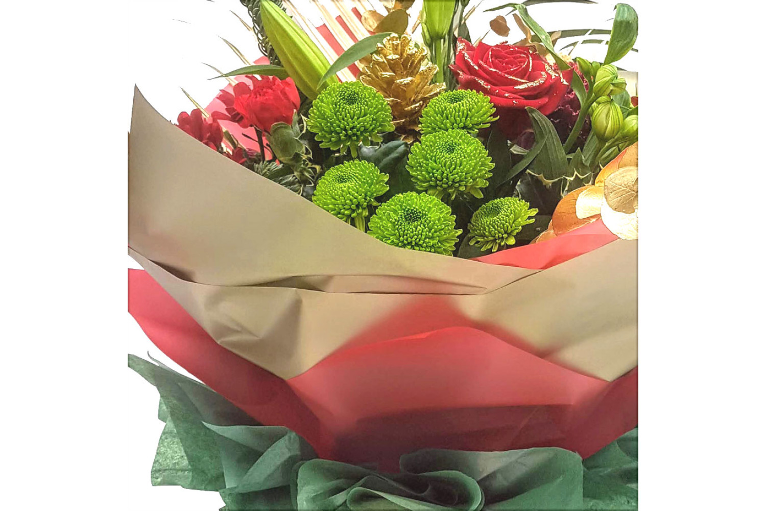 Bright and vibrant, this festive themed bouquet is our most popular Christmas gift. In traditional red and green these flowers complement each other perfectly. We’ve added spruce and gold trimmings for extra seasonal style.