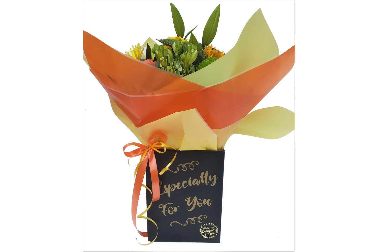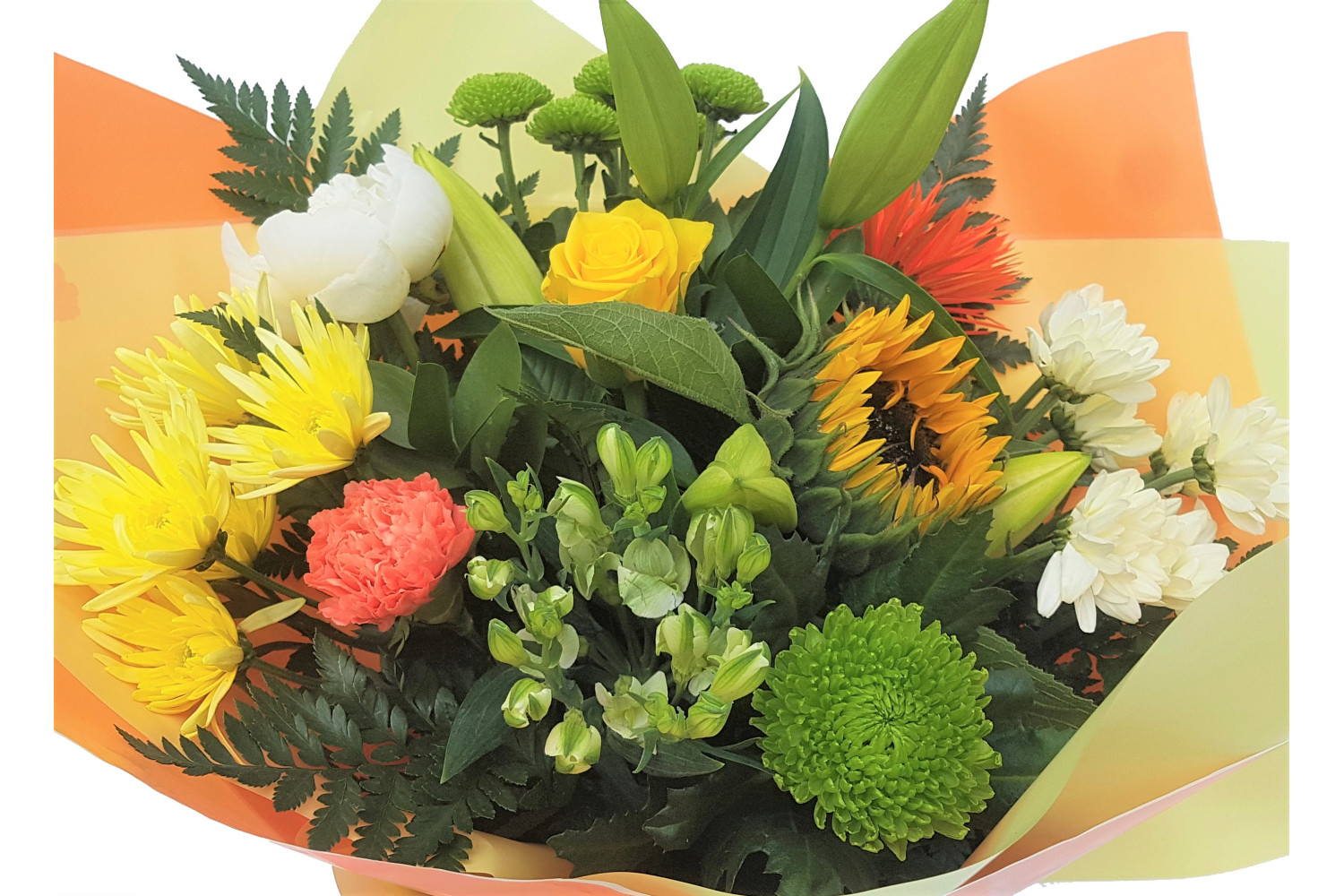 A bright and vibrant mix of orange and yellow florists choice flowers creates this never forgotten hand-tied bouquet of fresh flowers. Perfect to brighten anybody's day.Created to the highest standard by our team of expert florists in Maghull, Liverpool