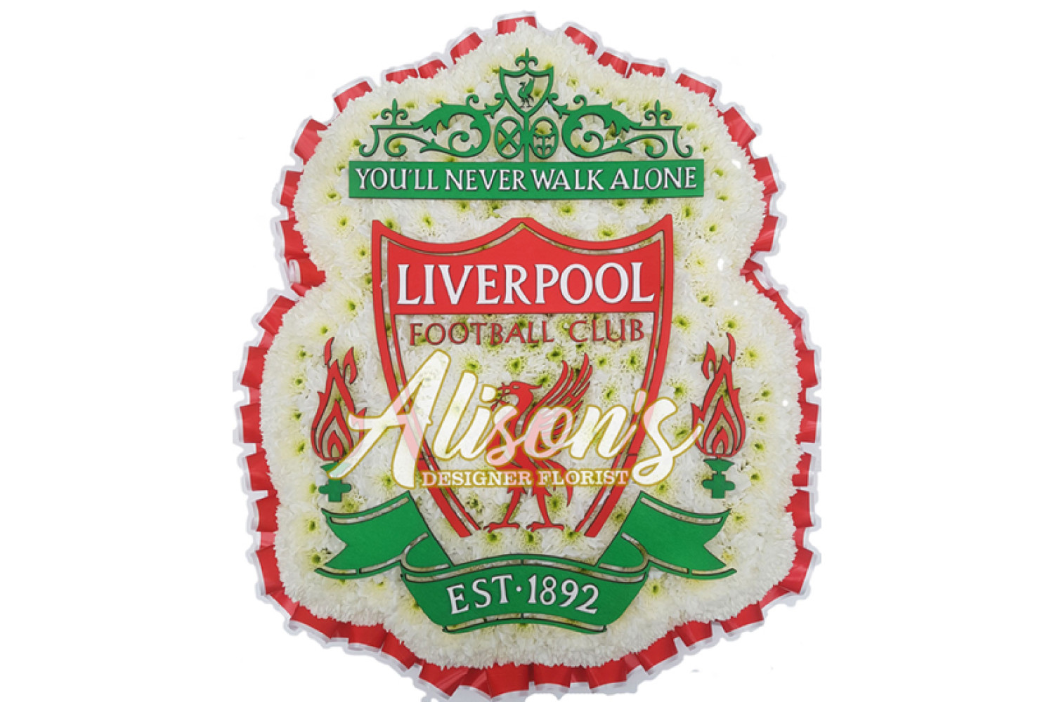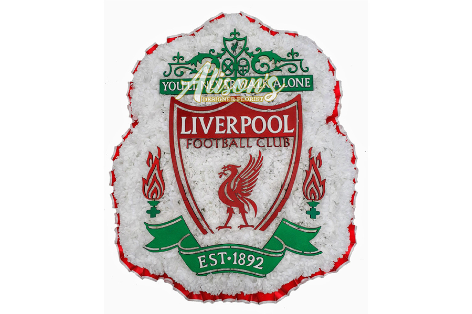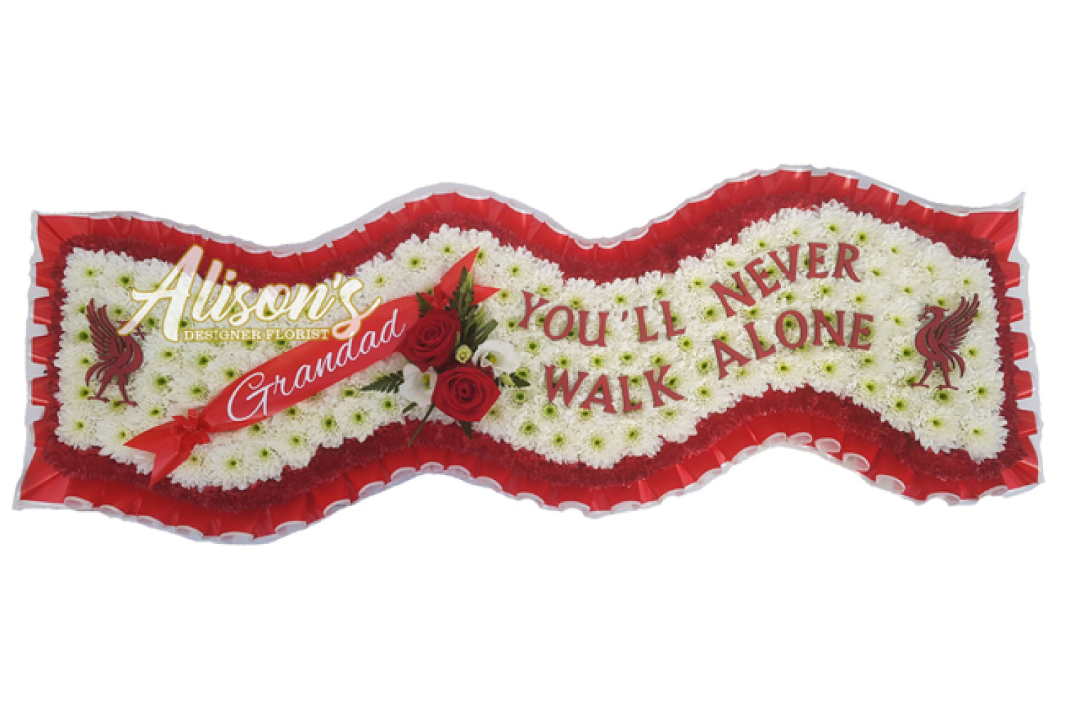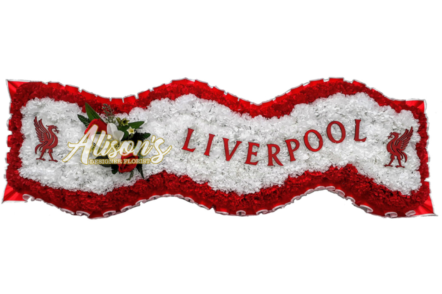 Here are a small selection of our tributes for Liverpool Football Club fans, including bespoke funeral arrangements like the Liverpool badge, you'll never walk alone Scarf, YNWA Cushion, Liverpool Football Shirts and Red & White Casket Sprays which are available here at Alison's Designer Florist. We also offer other sports-themed tributes, such as Dartboard, Rugby Ball, Wigan Athletic badge and many other various funeral flowers.