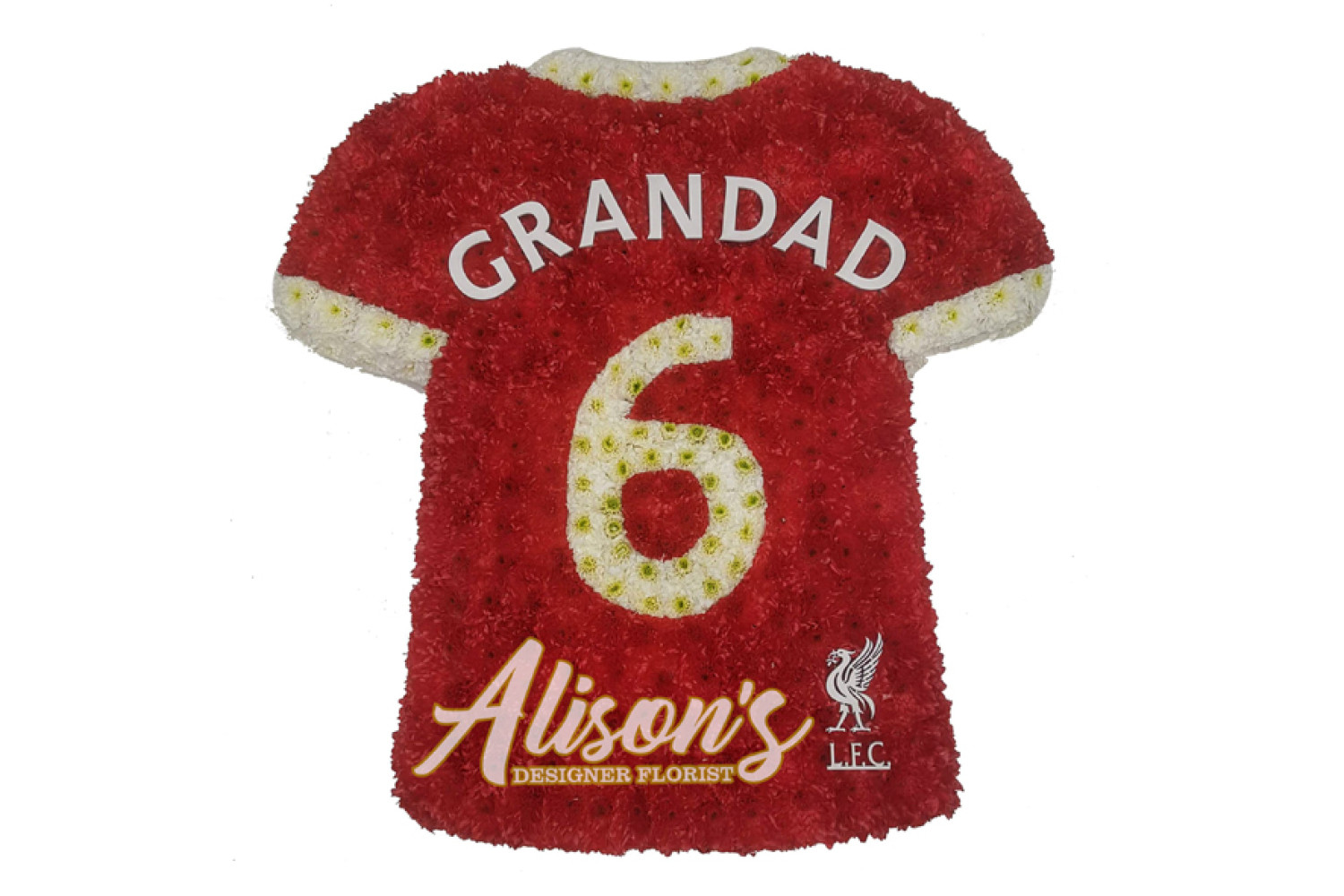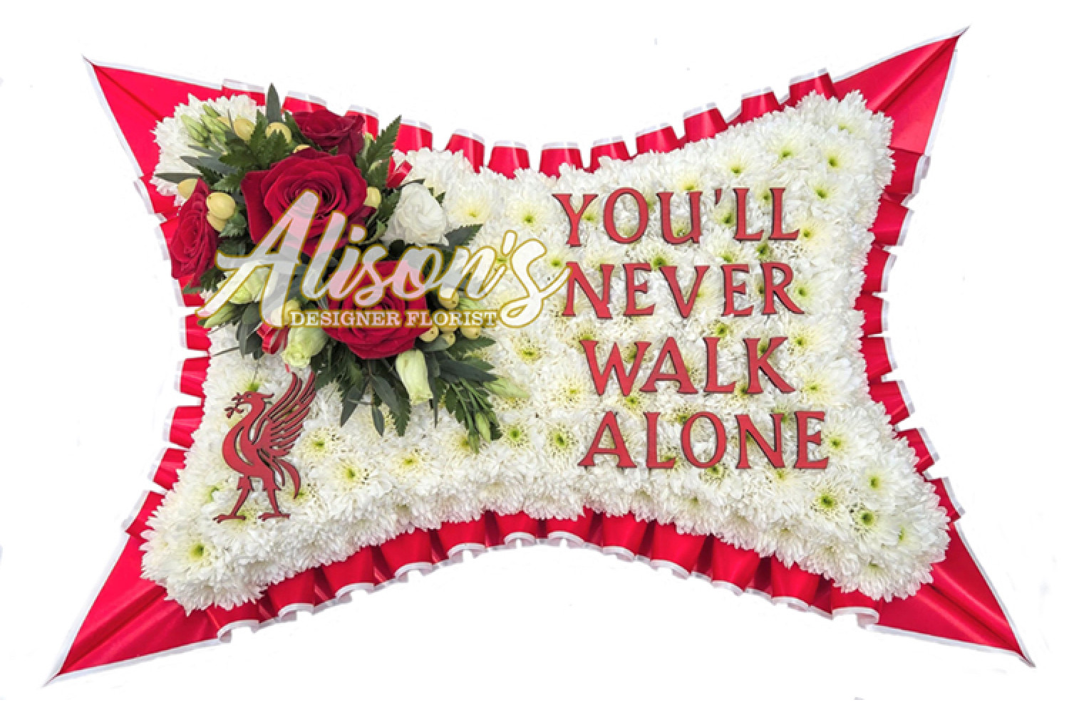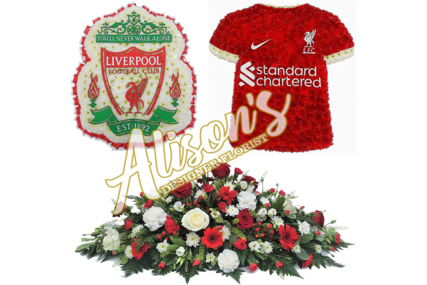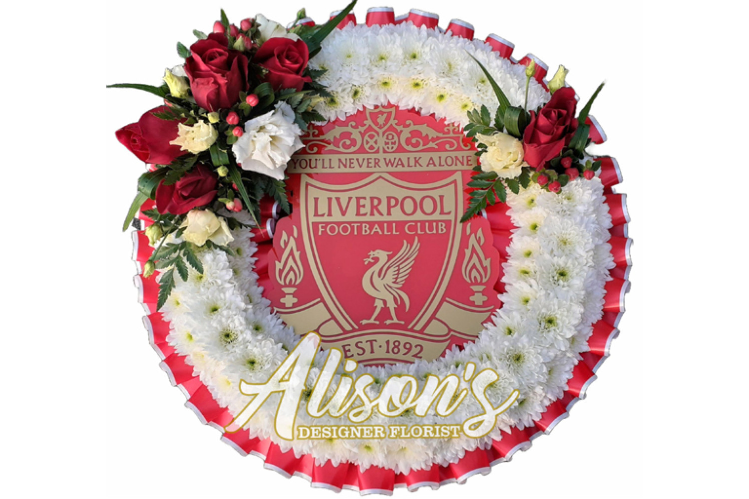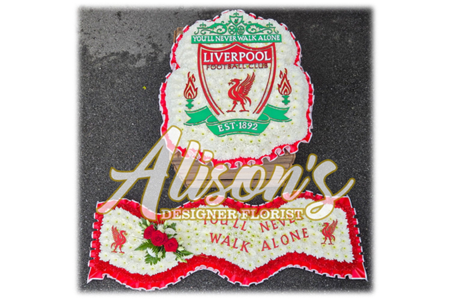 Here are a small selection of our tributes for Liverpool Football Club fans, including bespoke funeral arrangements like the Liverpool badge, you'll never walk alone Scarf, YNWA Cushion, Liverpool Football Shirts and Red & White Casket Sprays which are available here at Alison's Designer Florist. We also offer other sports-themed tributes, such as Dartboard, Rugby Ball, Wigan Athletic badge and many other various funeral flowers.