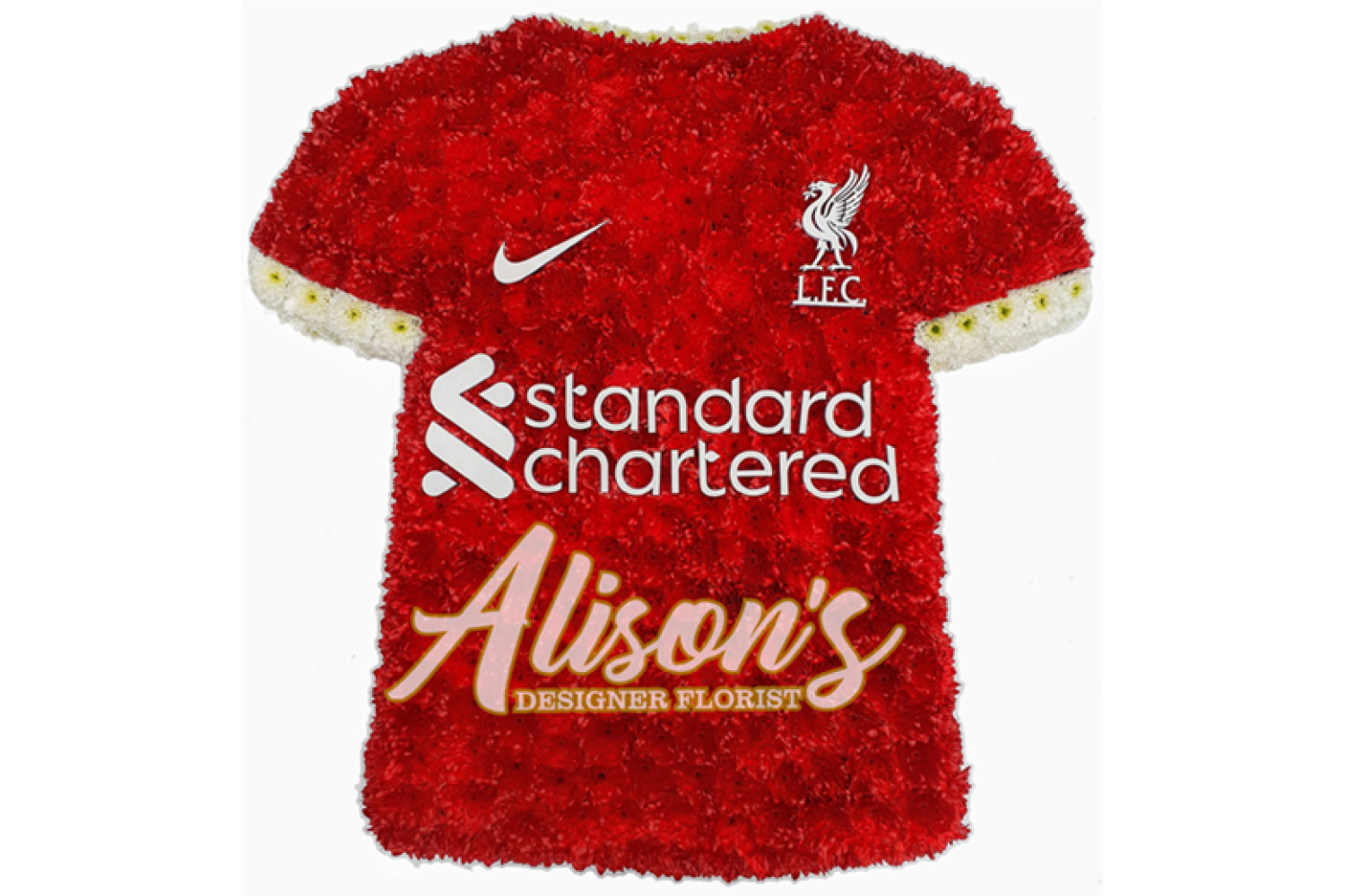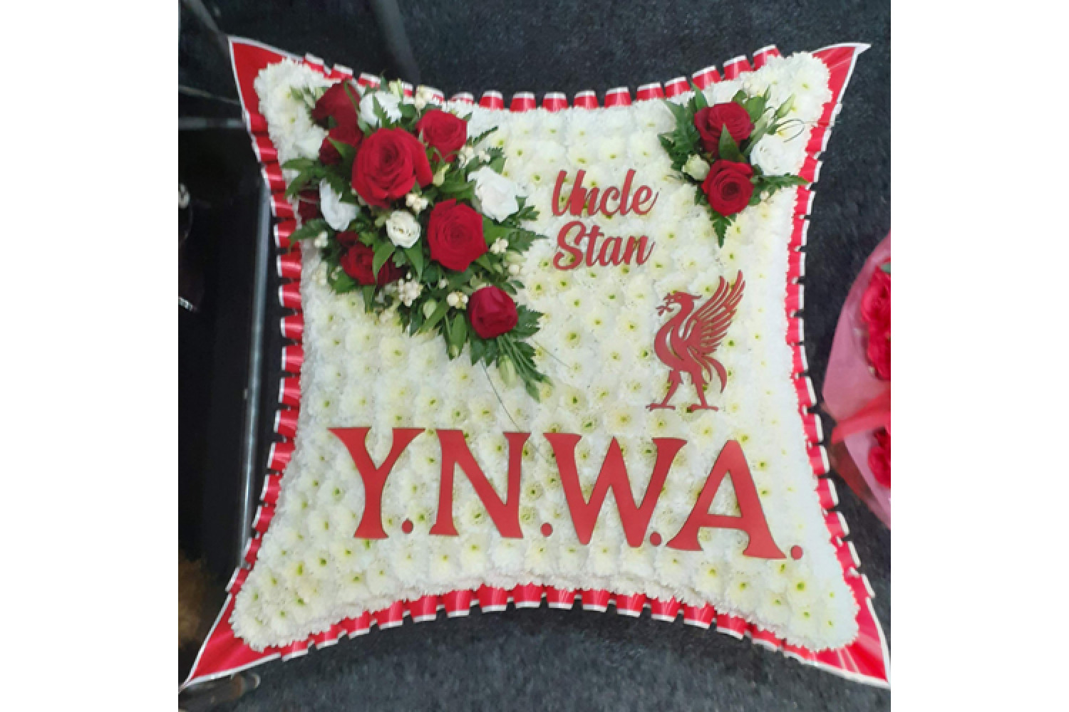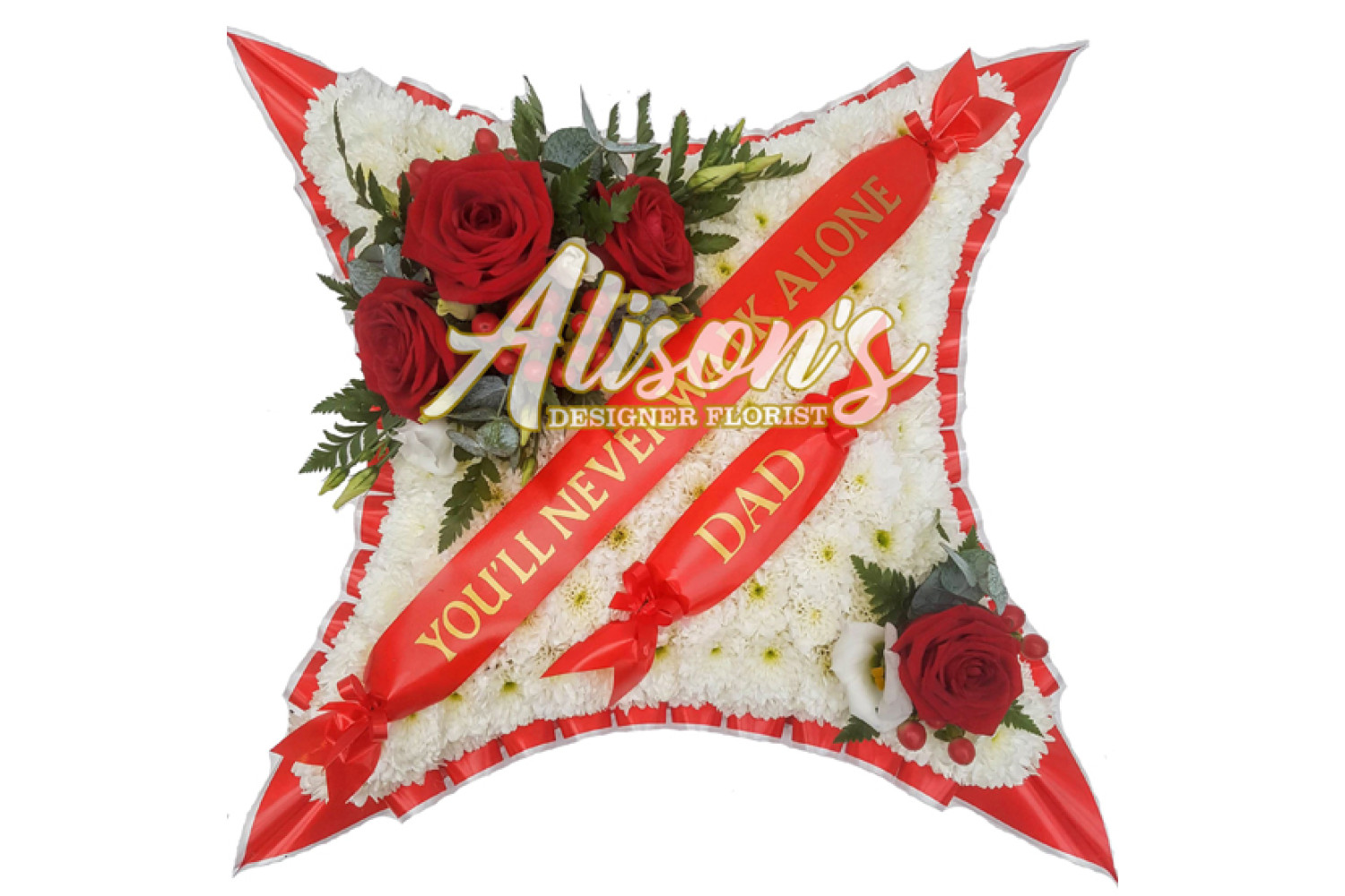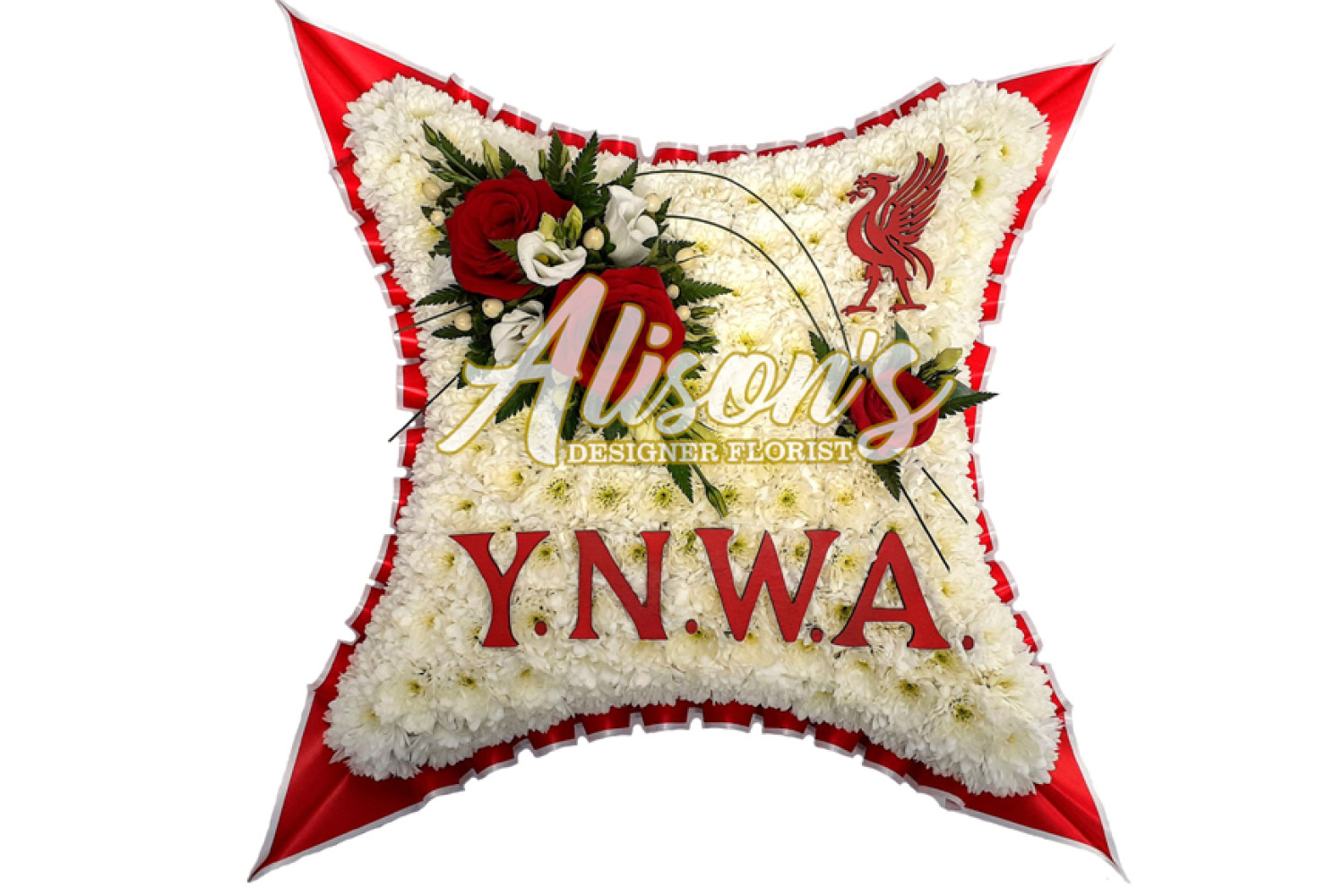 Here are a small selection of our tributes for Liverpool Football Club fans, including bespoke funeral arrangements like the Liverpool badge, you'll never walk alone Scarf, YNWA Cushion, Liverpool Football Shirts and Red & White Casket Sprays which are available here at Alison's Designer Florist. We also offer other sports-themed tributes, such as Dartboard, Rugby Ball, Wigan Athletic badge and many other various funeral flowers.