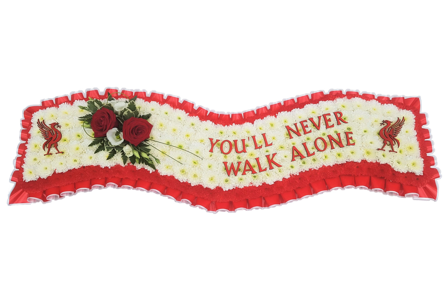 A massed chrysanthemum football scarf base edged in Red and white pleated ribbon with sprays to match with Large headed Red Roses and foliage with two liver birds and wording you'll never walk alone.