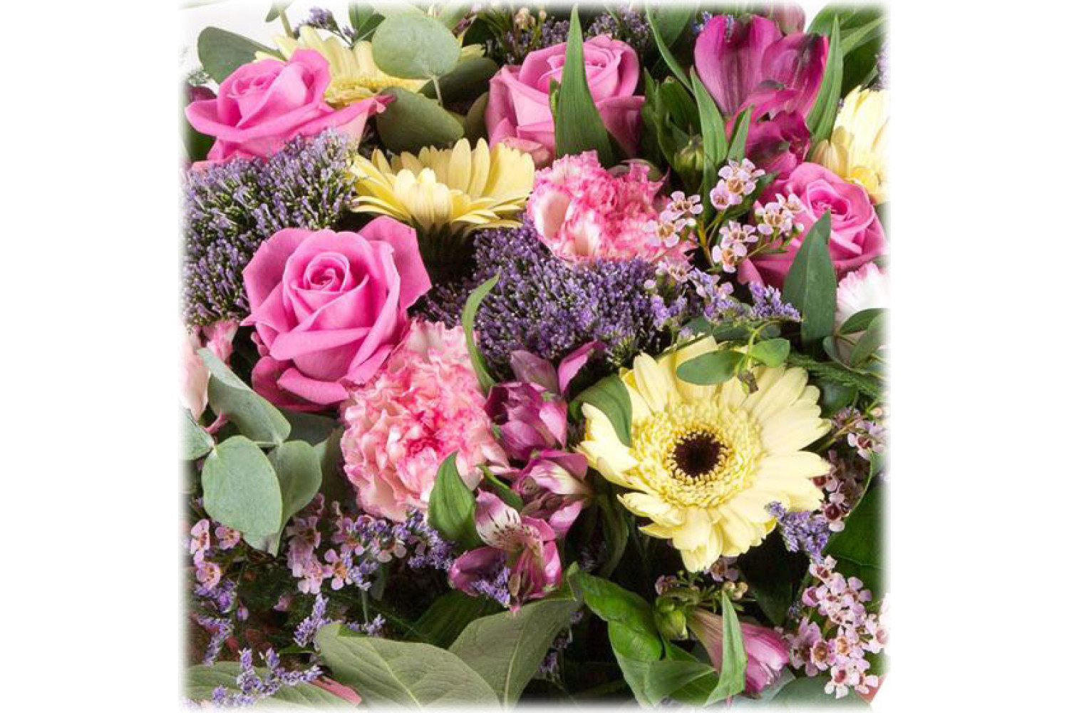 A delightful gift of lemon and pink blooms with a hint of lilac including roses and gerberas.Created to the highest possible standard by our team of expert florists in Maghull, Liverpool