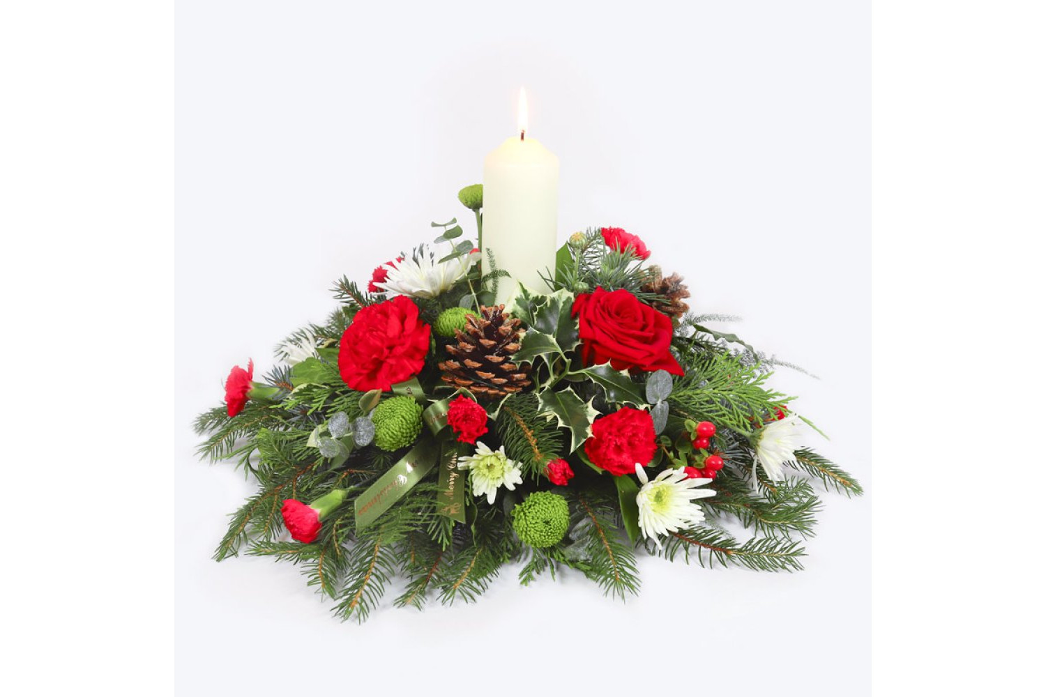 Tags: christmas, arrangement, candle, table centre, festive, red, gold, glitter