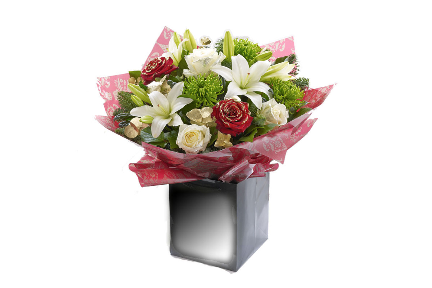 From snow white and velvety cream through to bright green and deep red, this bouquet showcases an elegant festive colour palette. The combination of fresh colours and a dusting of Christmas sparkle make this a truly wonderful gift.