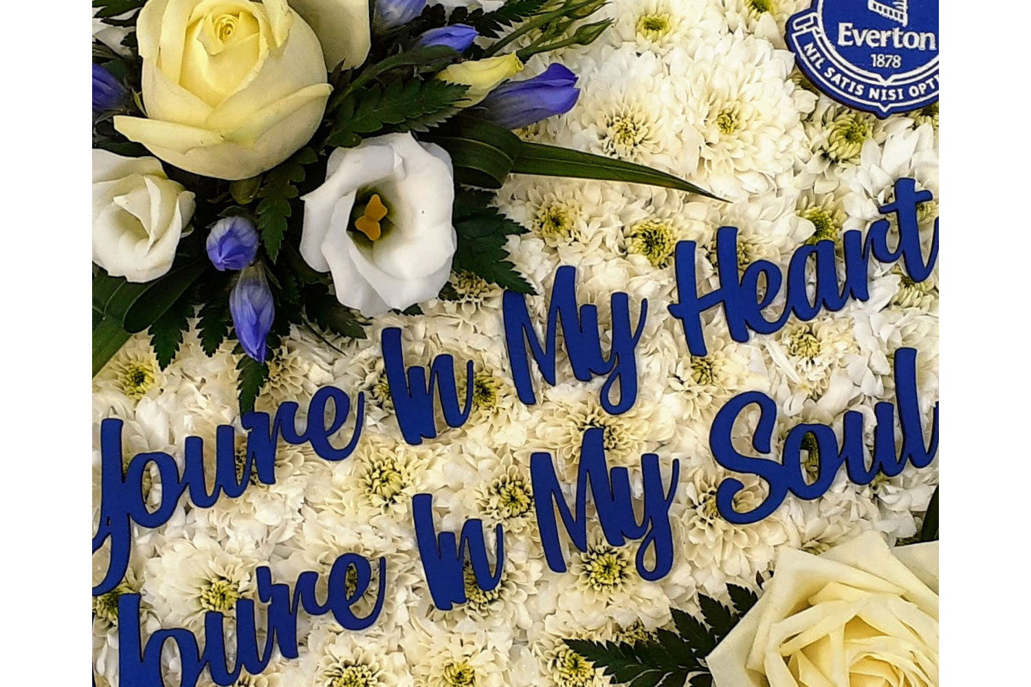 Honour the memory of a beloved Everton FC fan with our beautifully crafted Everton Cushion. This fitting tribute features the heartfelt message "You're in my heart, you're in my soul," elegantly displayed alongside the iconic Everton badge. Finished with a pleated blue and white ribbon trim, this cushion serves as a touching reminder of loyalty and passion for the club. Designed by Alison's Designer Florist in Maghull, it is the perfect addition to any memorial arrangement, celebrating the spirit of Everton in a meaningful way..