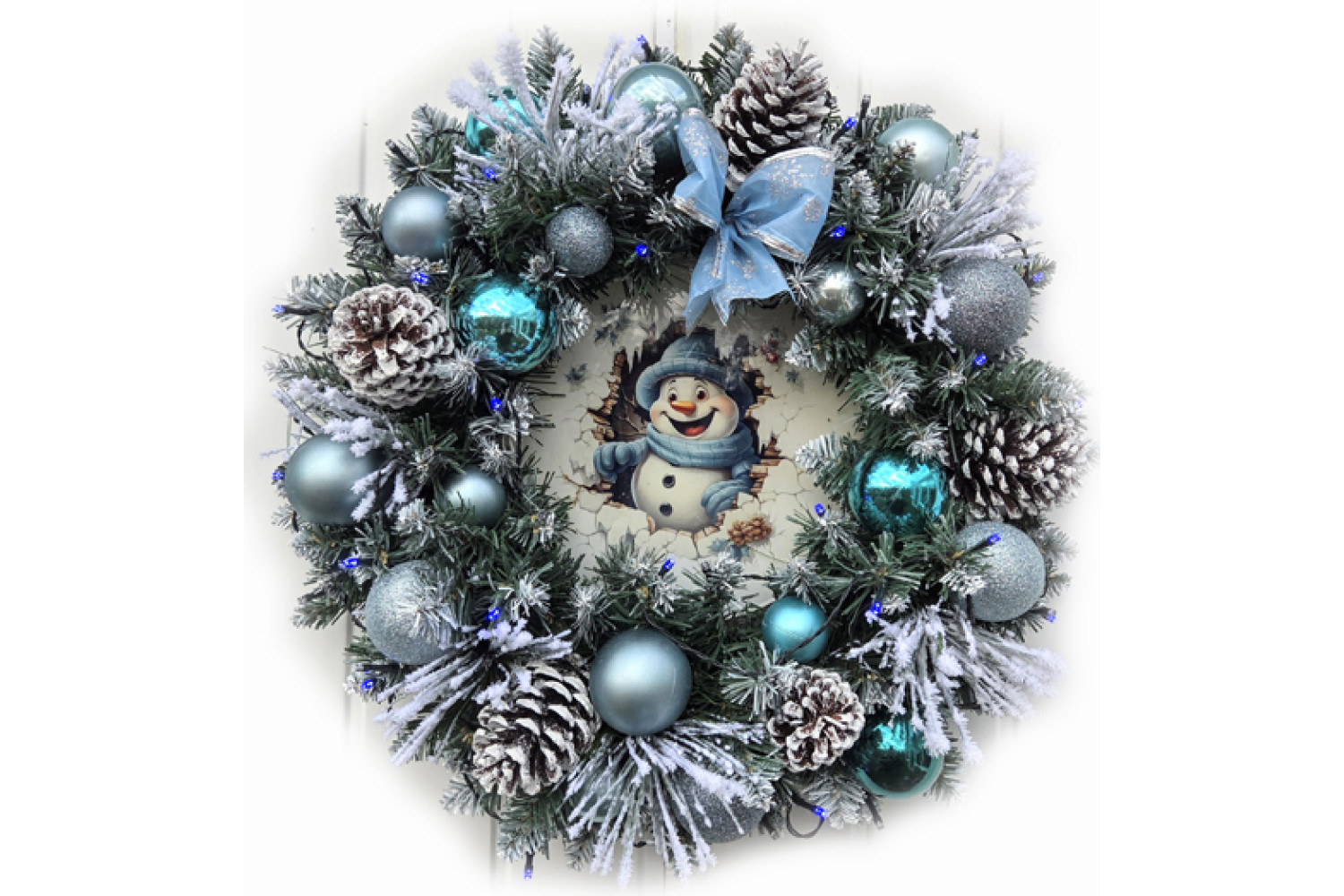 Transform your holiday decor with our enchanting Acrylic Snowman Plaque Christmas Door Wreath, designed by Alison's Designer Florist in Maghull. This delightful wreath features a charming snowman centerpiece, surrounded by 50 dazzling blue LED battery-operated lights that create a magical glow. With multi-function settings, you can easily switch up the ambiance to suit your festive mood. Perfect for welcoming guests and spreading holiday cheer, this wreath is a must-have for your Christmas celebrations. Elevate your entrance and make a lasting impression this season!
