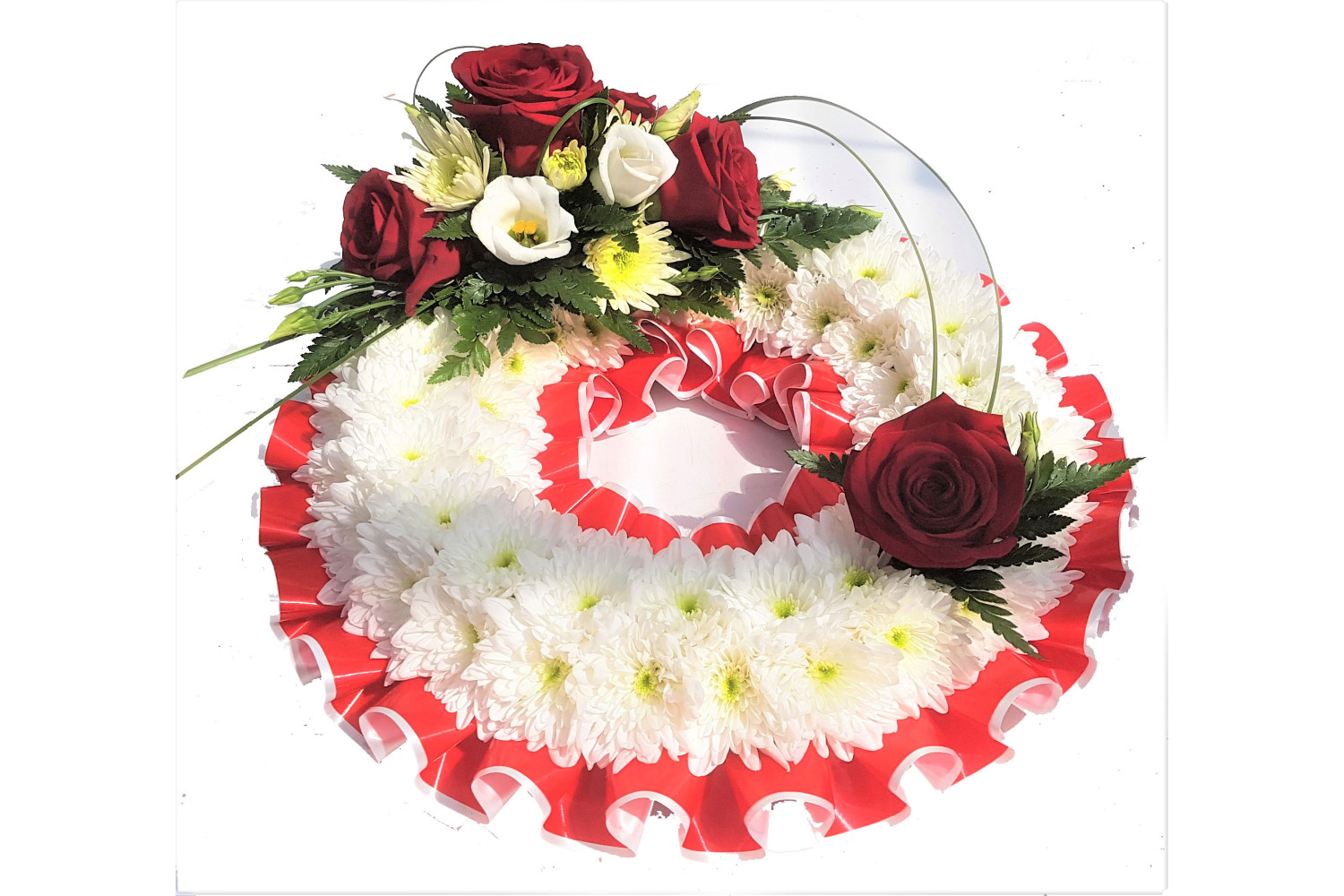 A classic selection of flowers traditional circular wreath by Alison's designer florist Maghull Liverpool