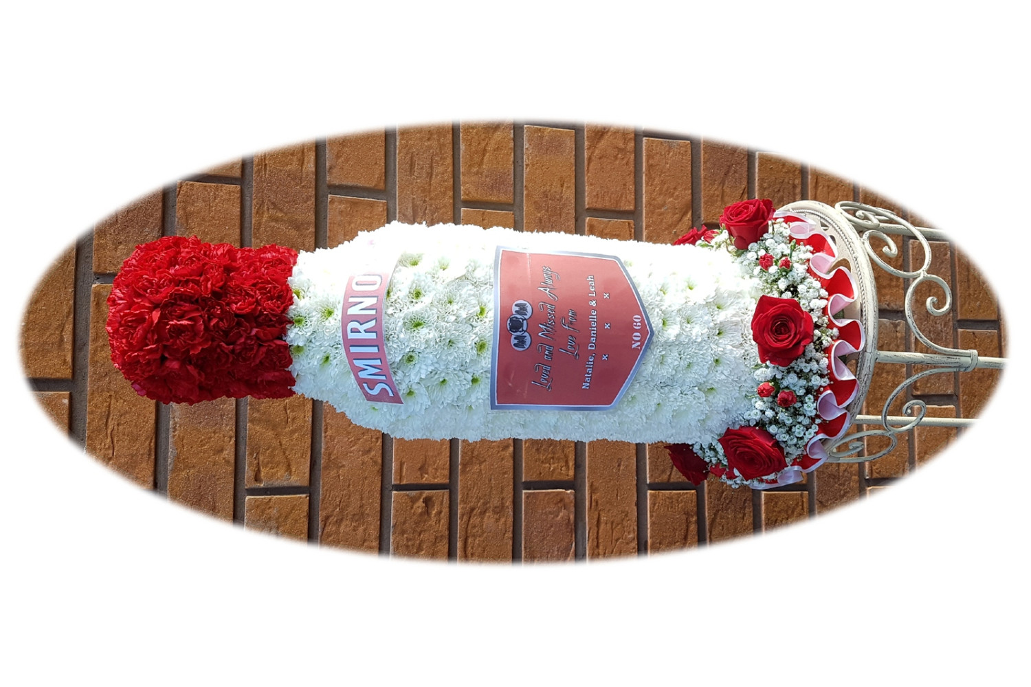 Smirnoff Vodka Bottle tribute created in white double chrysanthemums and red spray carnation flowers